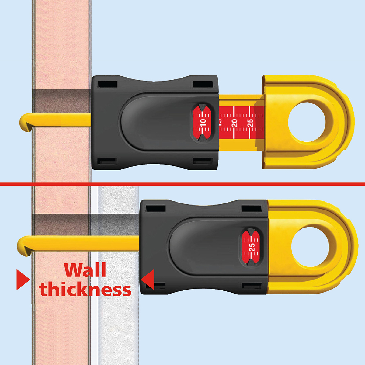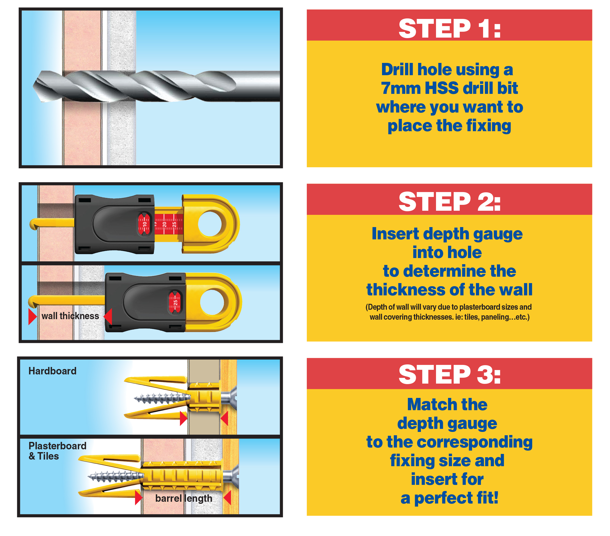 Includes measuring tool to gauge wall thickness and the correct fixing selection