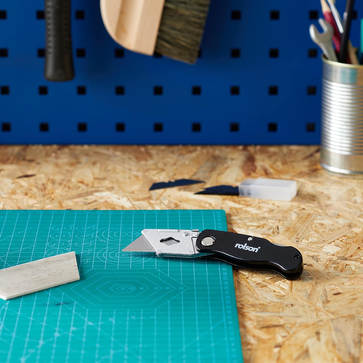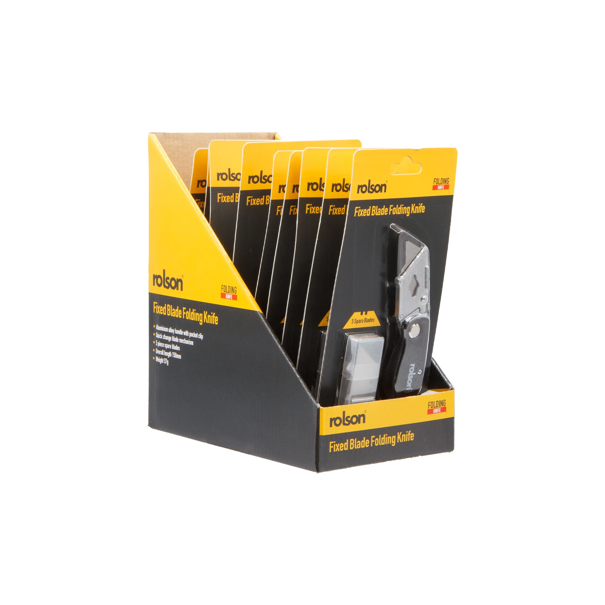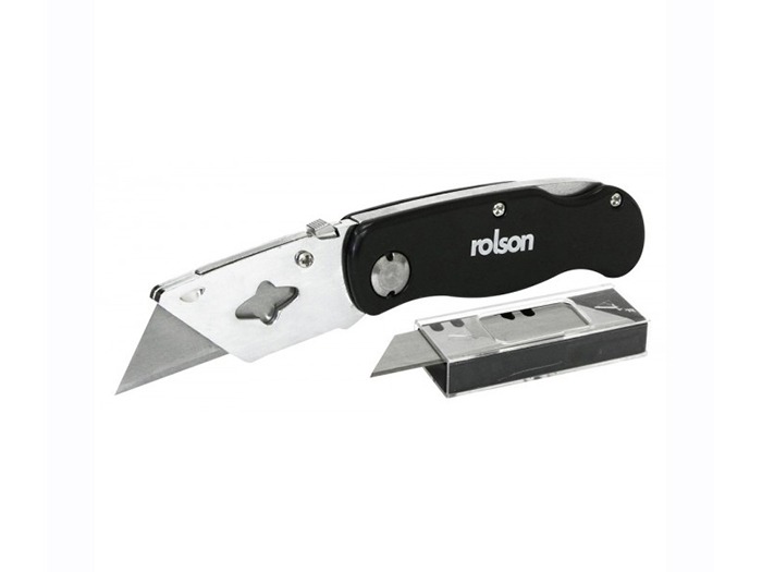 Folding Lock-Back Utility Knife – A utility knife where the blade folds back into the body making it compact and safe. Lightweight zinc alloy handle with belt clip on reverse. Quick blade change mechanism. Includes 5 blades.